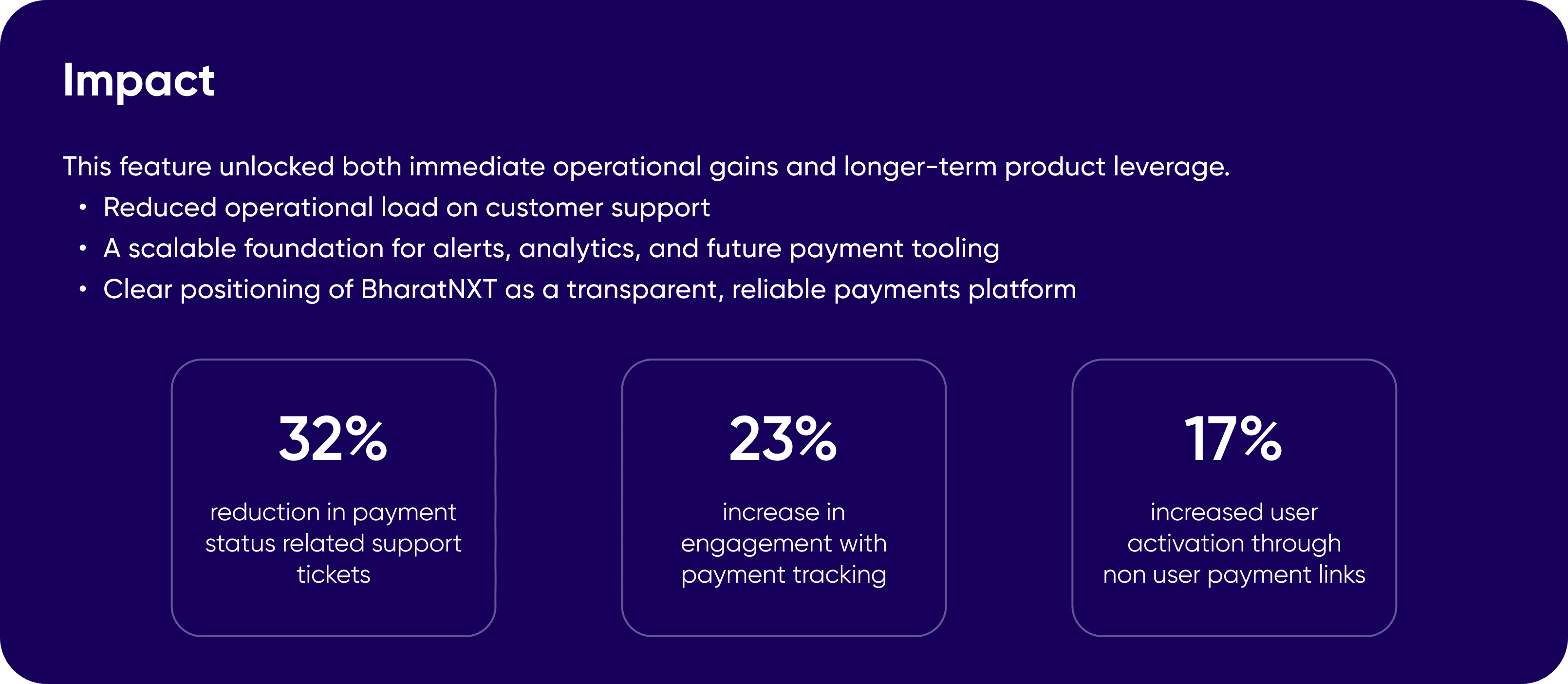 Designing this feature reinforced that clarity often matters more than speed in financial workflows making system status visible, especially for non-users, reduced uncertainty and built trust. Treating payer, payee, user, and non-user journeys as a connected system helped drive activation while reducing support friction. Working within a live payment infrastructure also highlighted the importance of intentional trade-offs to deliver impact without disrupting core flows.