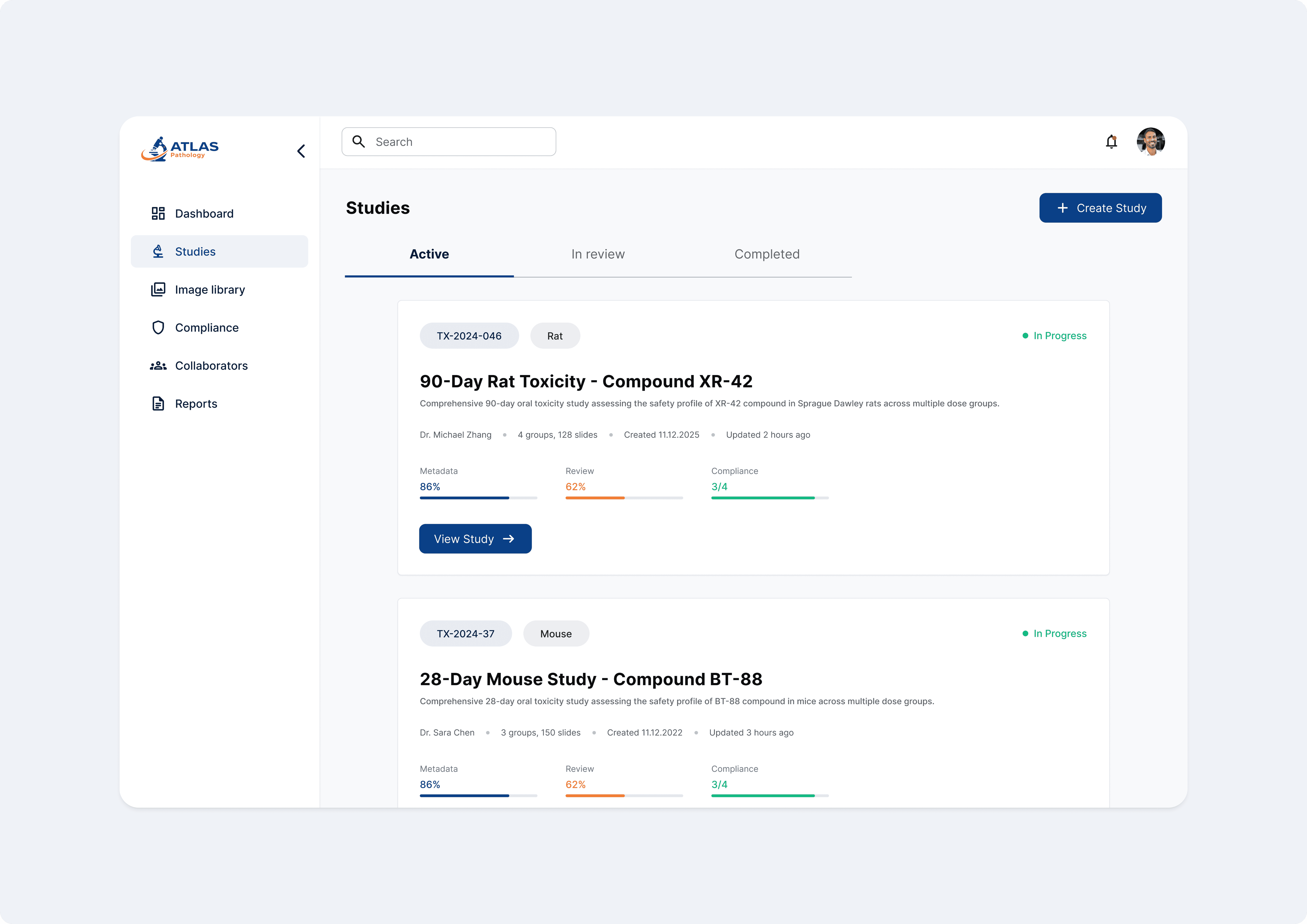 ATLAS Pathology is an AI powered platform that helps pharmaceutical companies test new drugs for safety by replacing fragmented workflows with a single, collaborative system for study management, image analysis, and AI-assisted decision support.